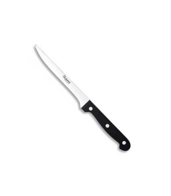 boning knife with black polyoxymethylene handle and stainless steel blade.