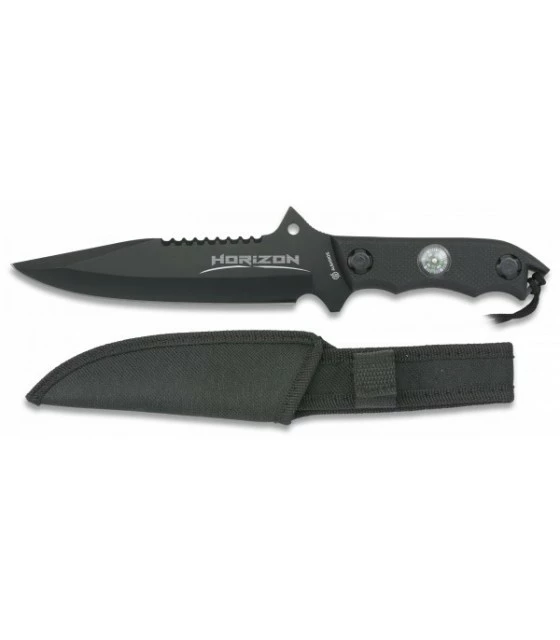 Horizon black tactical knife with ABS handle and stainless steel blade. It includes compass and nylon sheath.