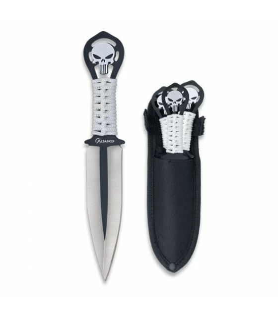 Three knives throwers of the brand Albainox, model skull. The pitchers are made of stainless steel and have the handle string. Include nylon sheath.