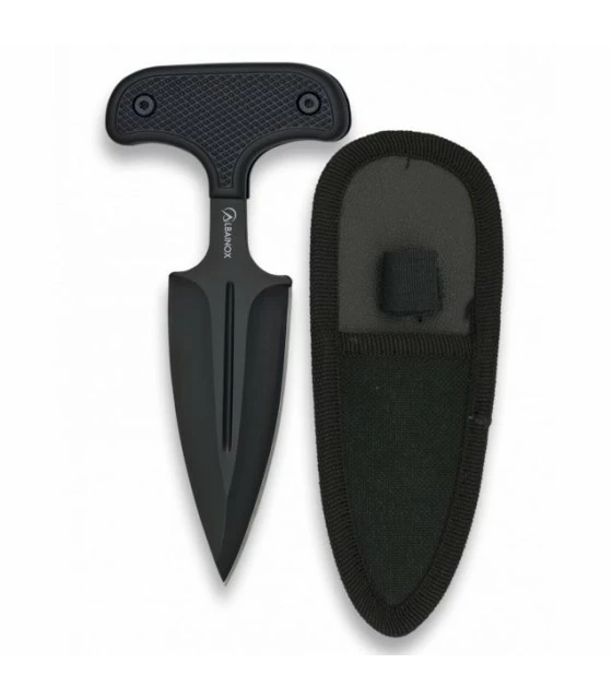 Black skinner knife. The blade is made of single-edged stainless steel. Includes nylon sheath.