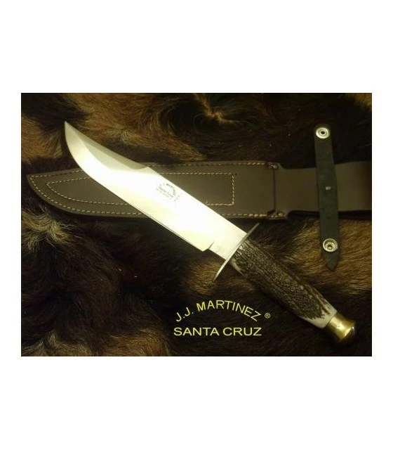 Hunting knife with deer horn handle and brass knob; is stainless steel sheet. The blade length is 23 cm. and the total of the knife is 36 cms. The weight of this knife is 400 grams. It includes leather sheath. craft knife manufactured by JJ Martinez house with fine quality materials.