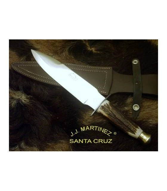 Hunting knife with handle Staghorn and brass knob; sheet is of stainless steel. The blade length is 23 cm. and the total of the knife is 36 cms. The weight of this knife is 400 grams. It includes leather case. craft knife manufactured by JJ Martinez house with fine quality materials.
