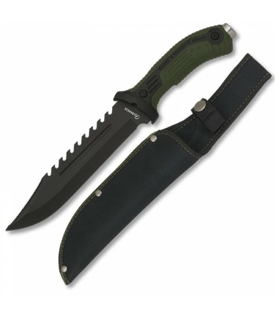 green tactical knife with blade made of stainless steel. The handle is made of ABS-Goma. It includes nylon sheath.