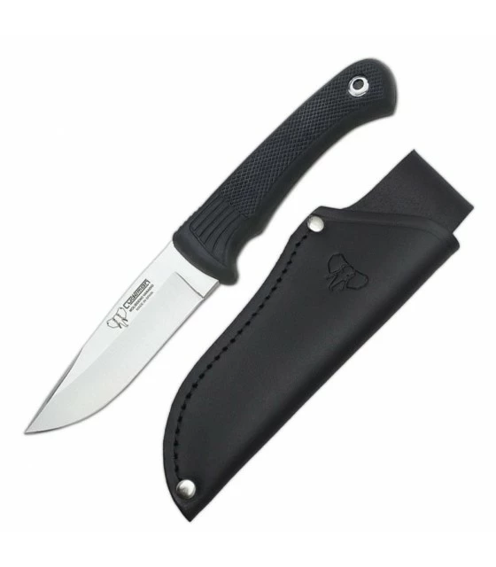 Hunting knife with handle of rubber. Manufactured entirely in Albacete (Spain) with noble materials of first quality. Includes leather holster. Features:
