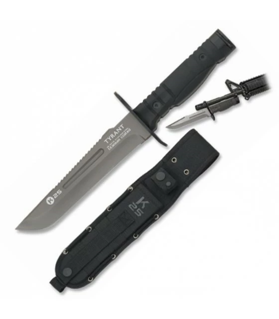 Tyrant K25 bayonet knife with stainless steel sheet plated titanium and aluminum handle.