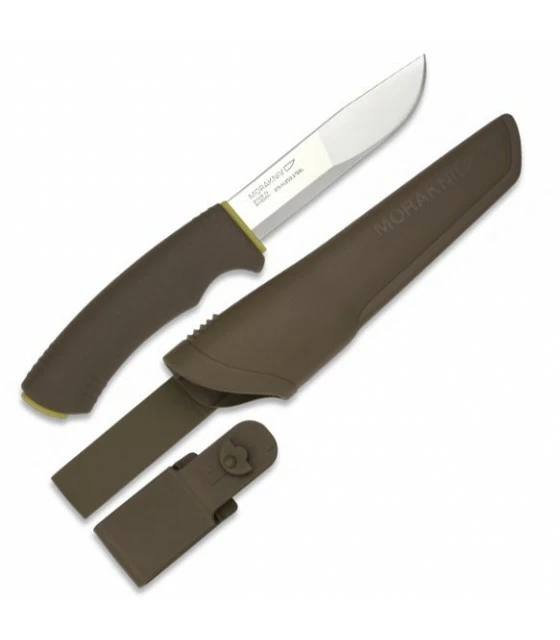Forest Buschcraft Morakniv knife with rubber handle and stainless steel blade. It includes ABS cover and 2 belt loops. Made in Sweden.