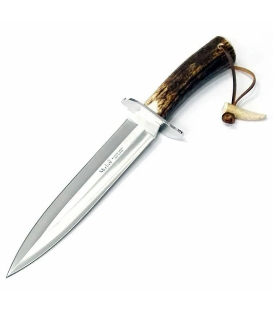 Muela Viking hunting knife with MoVa steel blade, Molybdenum Vanadium, and stag horn handle. With hole for securing cord. Includes leather sheath.