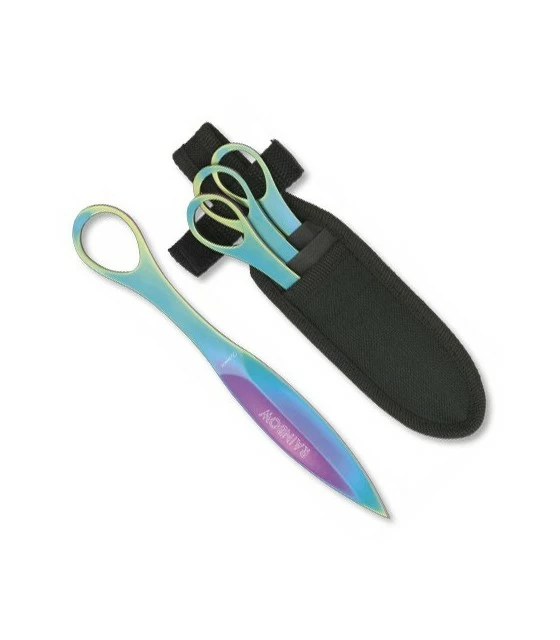 Set composed of 3 throwing knives sheathed Rainbow. Made of stainless steel. They include nylon sheath.