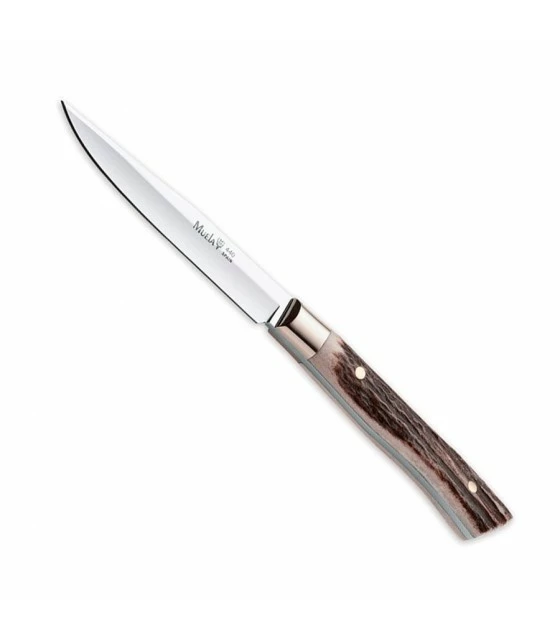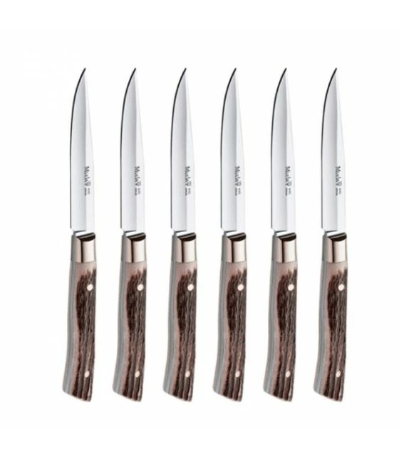 Set of 6 hunting knives of the brand Crush. The leaves are in MoVa and handles in a real deer antler. Presentation box included.
