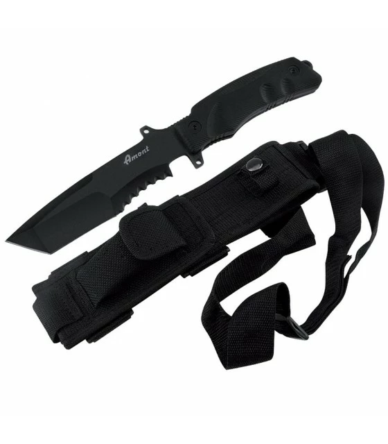 black tactical knife with stainless steel blade. 14.6 cms. The total length of the knife is 24.5 cm. It includes case.