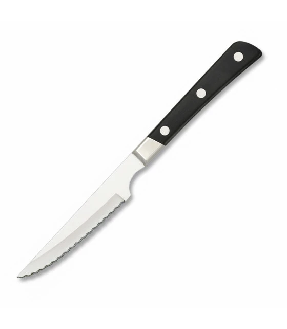 Top Cutlery steak knife with micro-saw blade in 3Cr13Mov steel, steel bolster and black POM handle.