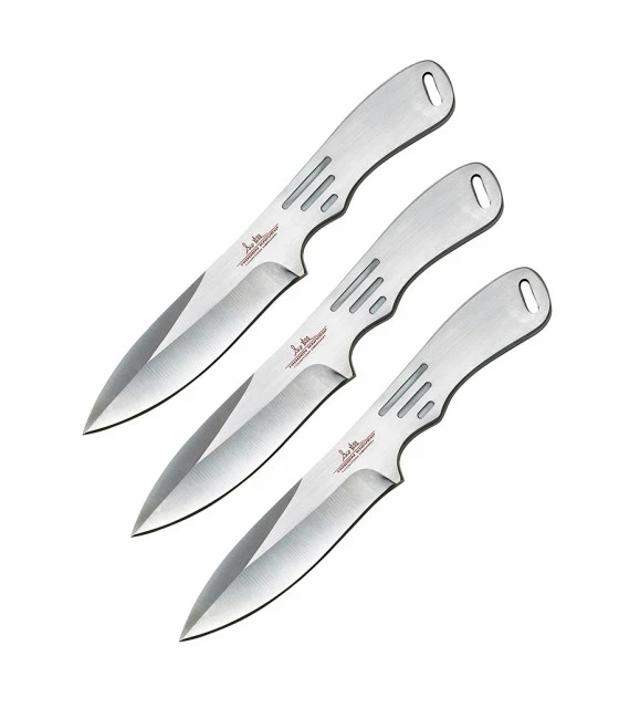 Set of Gil Hibben throwing knives from the United Cutlery Pro Thrower line designed for fast and precise throws. They are made of one piece 420 stainless steel and trigger type grip. Includes nylon sheath.